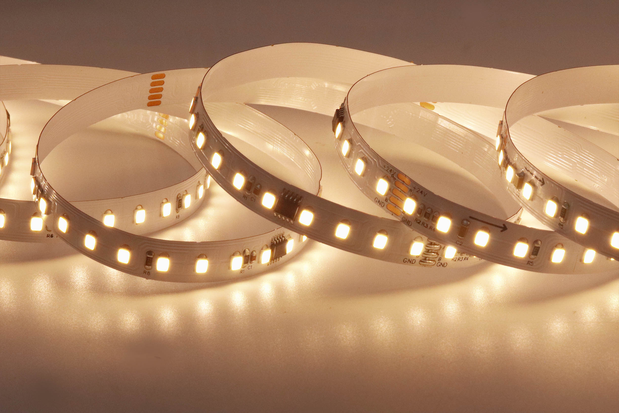 2.LED燈帶供電電壓為24V,過長使用(超過5米)壓降上升,導致尾部供電電壓不足,造成LED亮度不均勻,建議添加電源補電。