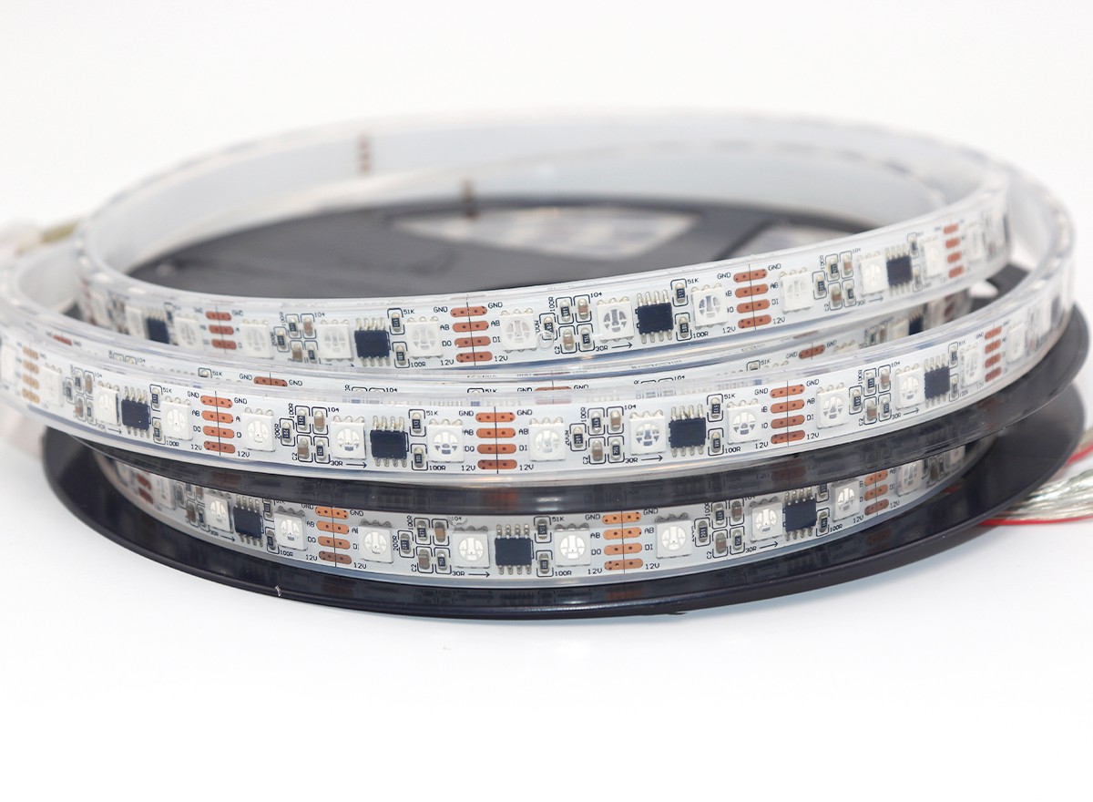 1、控制原理:一個(gè)IC控制三顆LED組成一個(gè)回路(一組),控制器通過(guò)控制IC對(duì)FPCB里面的電路進(jìn)行控制,從而控制LED燈條變化不同的效果;如閃爍,追逐,跳變,順時(shí)針跑馬,逆時(shí)針跑馬,單色跑馬,變色跑馬,單顆追逐從頭到尾,流水,模擬閃電等;也可以根據(jù)客戶需要,自行編寫,編寫出所有想要的效果。