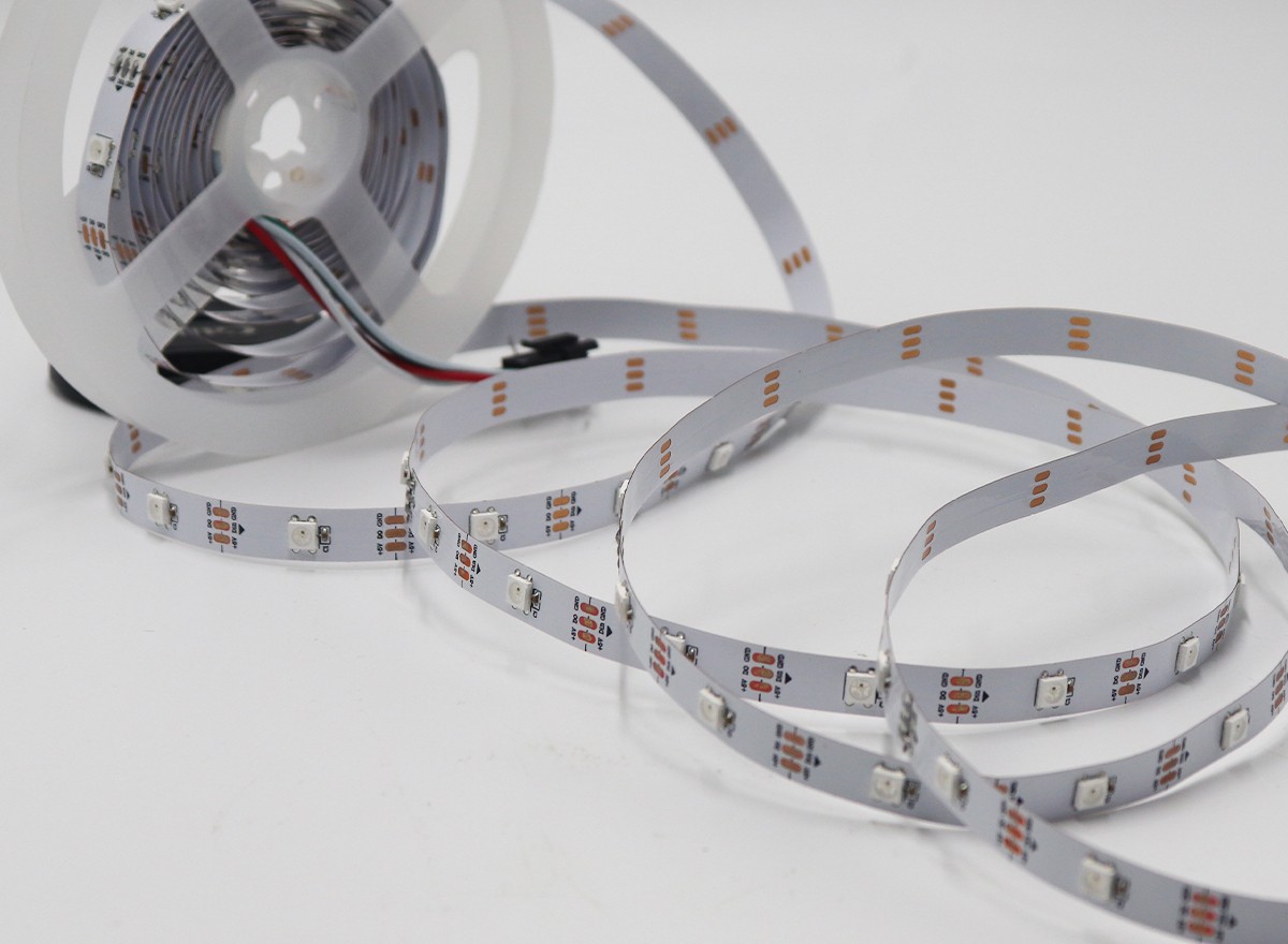 1、控制原理:一個(gè)IC控制1顆LED組成一個(gè)回路(一組),控制器通過(guò)控制IC對(duì)FPCB里面的電路進(jìn)行控制,從而控制LED燈條變化不同的效果;如閃爍,追逐,跳變,順時(shí)針跑馬,逆時(shí)針跑馬,單色跑馬,變色跑馬,單顆追逐從頭到尾,流水,模擬閃電等;也可以根據(jù)客戶需要,自行編寫(xiě),編寫(xiě)出所有想要的效果。